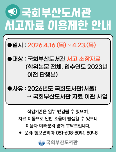 국회부산도서관 서고자료 이용이 제한되니 이용에 참고하시기 바랍니다.